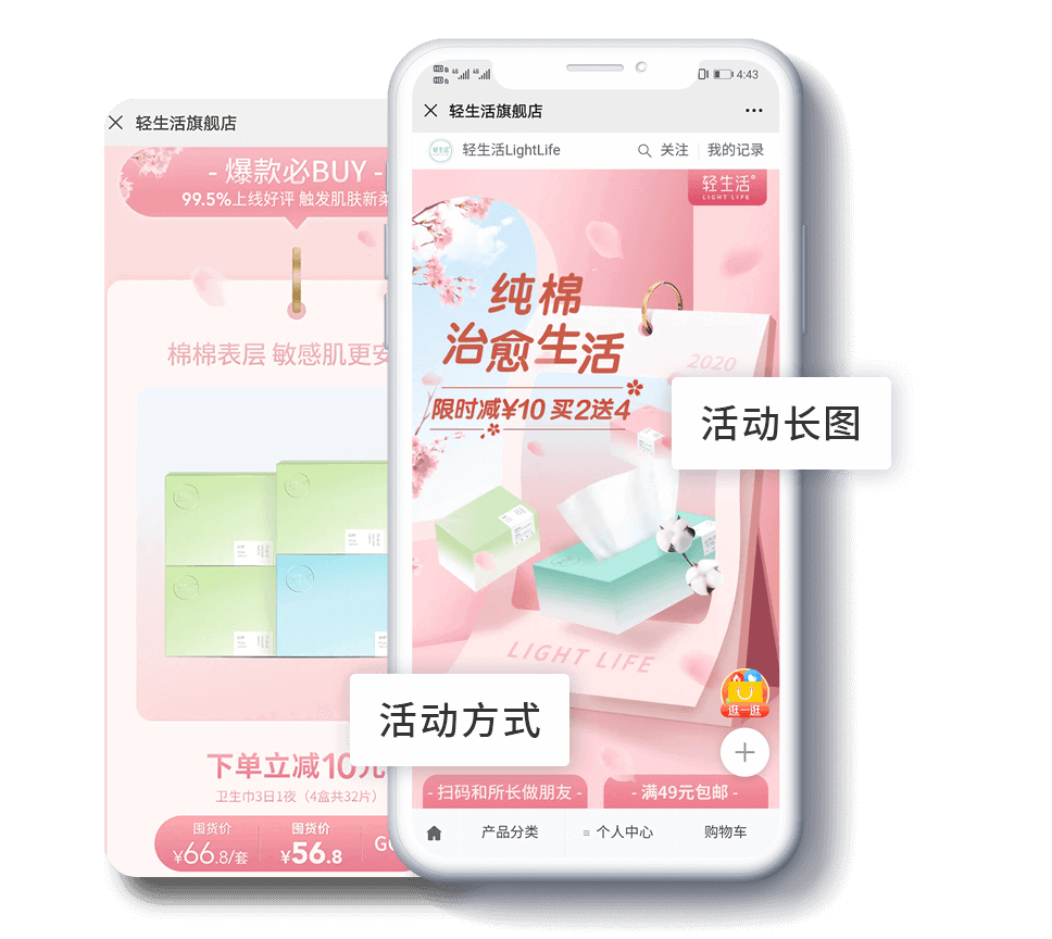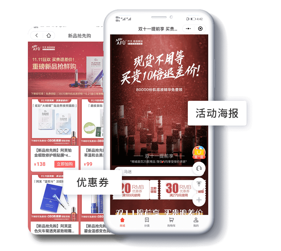 商城支持組件化模塊裝修,多樣個性化展現(xiàn),快速搭建與眾不同的高顏值商城。